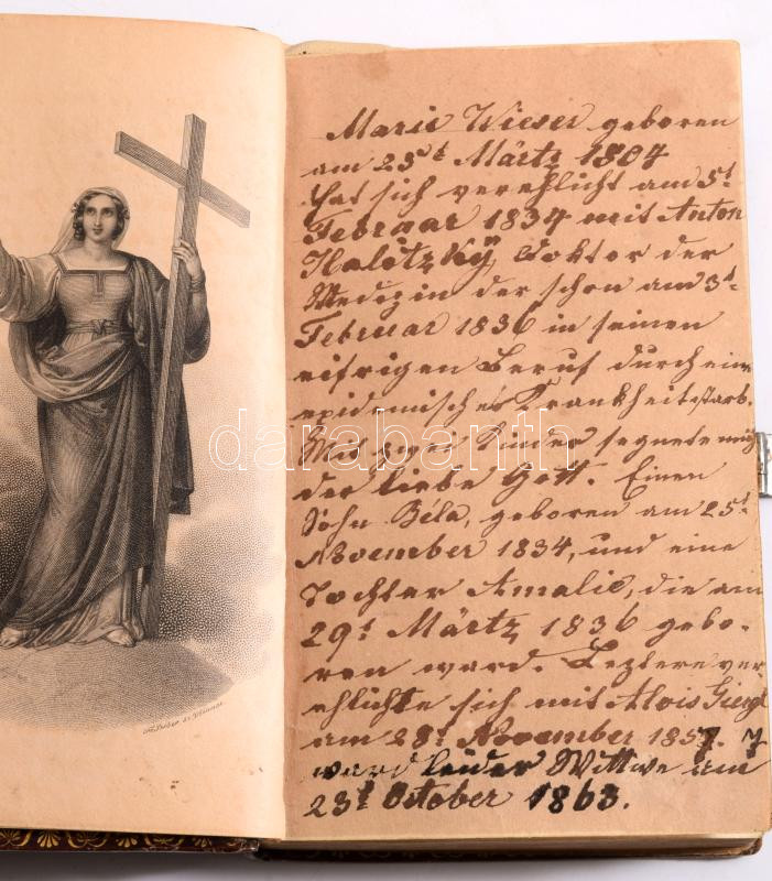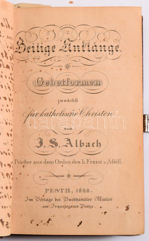 Albach, J. S.: Heilige Anklänge. Gebetformen zunächst für katholische Christen. Pest, 1828, Buchhändler Müller, 1 t.+ 380 p. Német nyelven. Aranyozott gerincű, fémveretes, kapcsos egészbőr-kötésben, megkímélt állapotban.