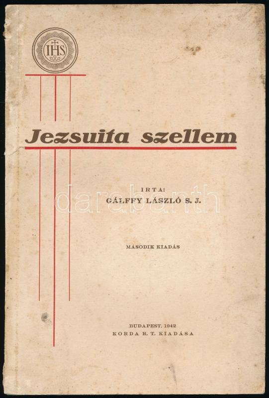 Gálffy László: Jezsuita szellem. Bp., 1942, Korda Rt., 1 t.+ 87+[1] p. Második kiadás. Kiadói papírkötés, viseltes, foltos borítóval, sérült gerinccel, helyenként lapszéli ázásnyomokkal.
