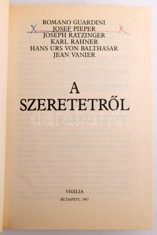 Guardini-Pieper-Ratzinger-Rahner-Batlhasar-Vanier: A szeretetről. Bp., 1987, Vigilia. 465p. Kiadói kartonált kötés, jó állapotban.