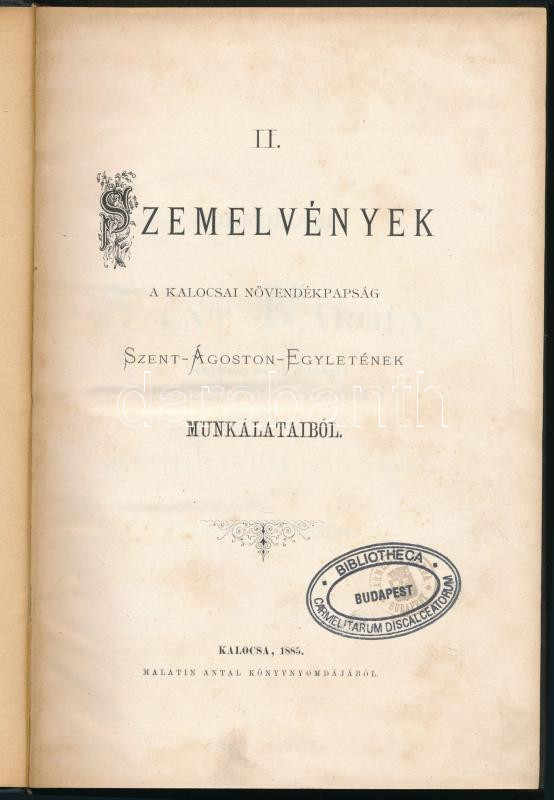 Szemelvények a kalocsai növendékpapság Szent-Ágoston-Egyletének munkálataiból. Kalocsa, 1885, Malatin Antal Könyvnyomdájából. Kiadói egészvászon-kötésben. Volt könyvtári könyv