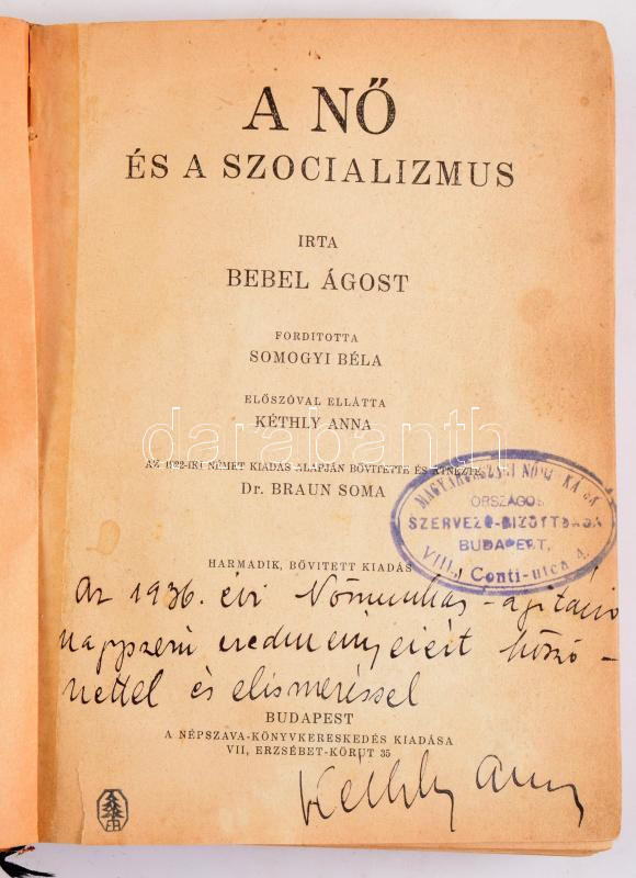 Bebel Ágost: A nő és a szocializmus. Fordította: Soomogyi Béla. Előszóval ellátta: Kéthly Anna. Kéthly Anna dedikációjával! Bp., Népszava. 488p. Félvászon kötés, kopottas állapotban.