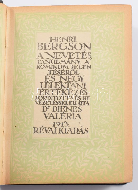 Bergson, Henri: A nevetés, tanulmány a komikum jelentéséről és négy lélektani értekezés. Fordította: Dr. Dienes Valéria. Bp., 1913, Révai. A címlap és kötés rajzát Zádor István készítette. 351p. Kiadói egészvászon kötés, gerinc sérült, kopottas állapotban.