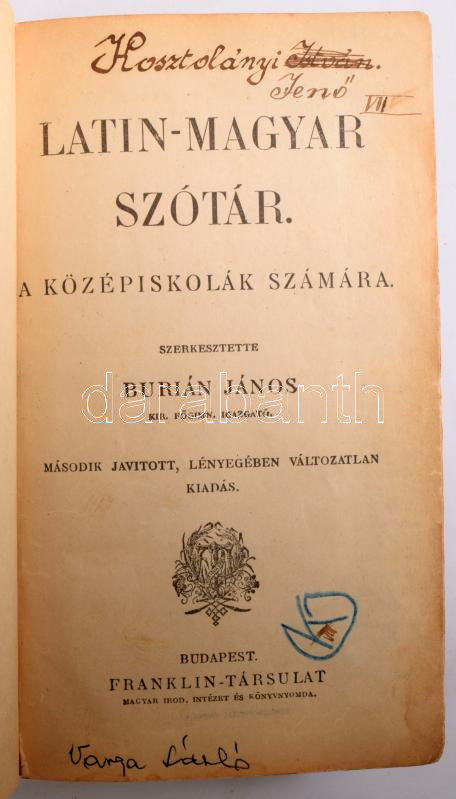 Burián János (szerk.): Latin-magyar szótár a középiskolák számára. Bp., [1937], Franklin-Társulat, VI+[2]+847+[1] p. Második kiadás. Átkötött egészvászon-kötésben, tulajdonosi bejegyzésekkel.