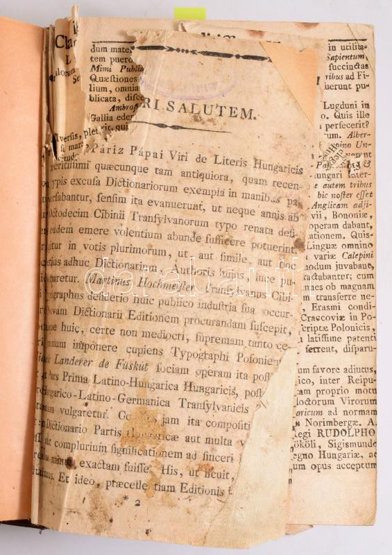 [Pápai Páriz Ferenc - Molnár Albert - Bod Péter]: Dictionarium latino-hungaricum. / Dictionarium ungaro-latino-germanicum. [Egybekötve.] Cibinii & Posonii [Nagyszeben-Pozsony], 1801, Martini Hochmeister et Mich. Landerer, [14]+710+[2] p.; [2]+406+[104] p. Félvászon-kötésben, rossz állapotban, levált gerinccel, az I. kötet címlapja hiányzik, helyenként erősen sérült lapokkal.
