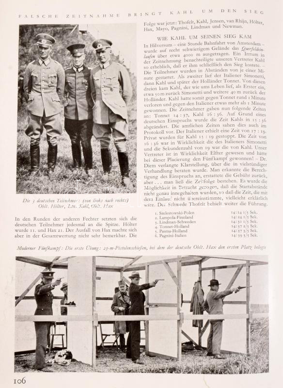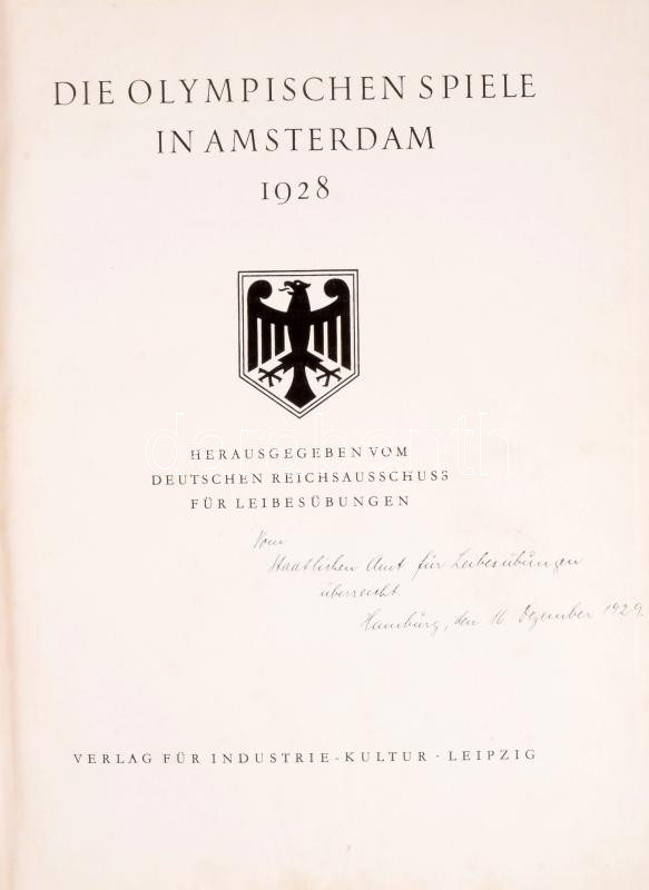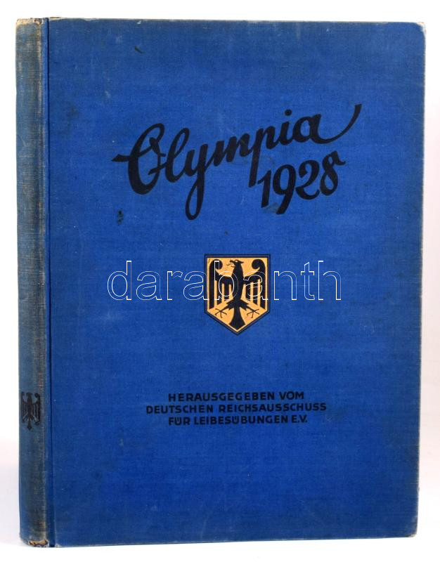 Die Olympischen Spiele in Amsterdam 1928. Herausgegeben vom Deutschen Reichsausschuss für Leibesübungen. Leipzig, 1928, Verlag für Industrie-Kultur, 231+[1] p.+ 3 (kihajtható) t. Fekete-fehér képekkel illusztrálva. Német nyelven. Kiadói egészvászon-kötés, kissé kopottas borítóval.
