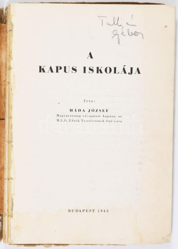 Háda József: A kapus iskolája. Magyarország válogatott kapusa, az M.L.Sz. Edzők Testületének főtitkára. [Bp.], 1943., Szerző, (Kiss János-ny.), 86+[10] p.