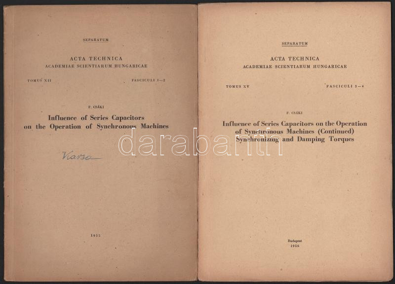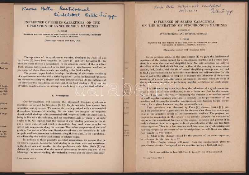 Csáki Frigyes (1921-1977) villamosmérnök, egyetemi tanár 2 db dedikált különnyomata: Influence of Series Capacitors on the Operation of Synchronous Machines.; Influence of Series Capacitors on the Operation of Synchronous Machines (Continued). Synchronizing and Damping Torques. Acta Technica. A Magyar Tudományos Akadémia Műszaki Tudományok Osztályának közleményei. Bp., 1955-1956, MTA, [49]-84 p.; [457]-476 p. Kiadói papírkötés.