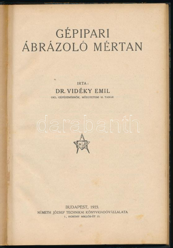Dr. Vidéky Emil: Gépipari ábrázoló mértan. Bp., 1923, Németh József Technikai Könyvkiadó. Újrakötött félvászon kötés