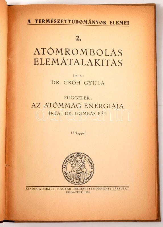 Gróh Gyula, Dr.: Atómrombolás elemátalakítás. Írta: --. Függelék: Az atómmag energiája. Írta: Dr. Gombás Pál. 13 képpel. Budapest, 1935, Királyi Magyar Természettudományi Társulat. A Természettudományok Elemei. 2. Kiadói papírborítóban