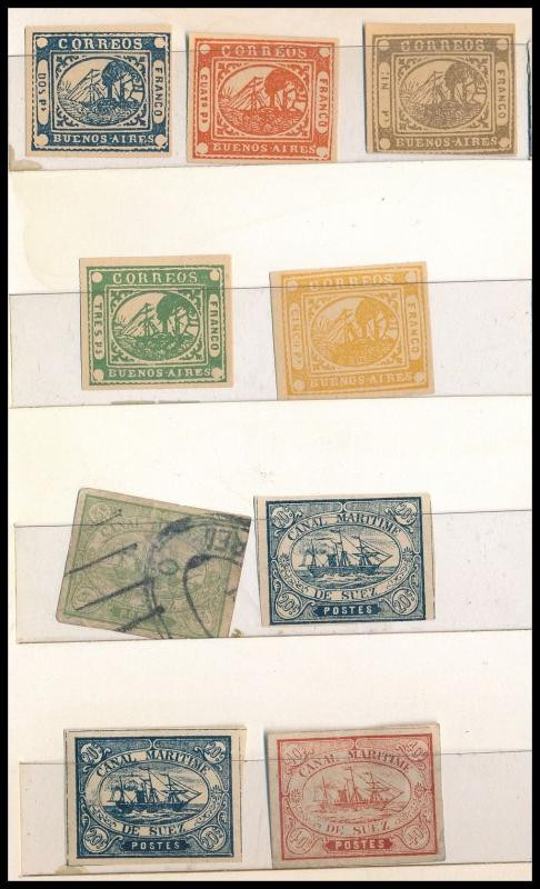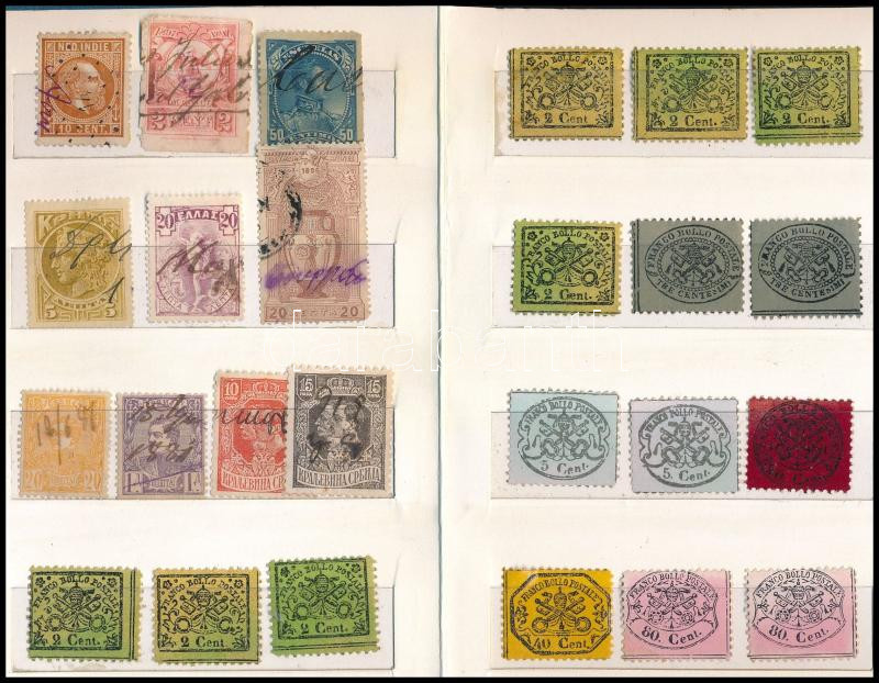 34 db régi bélyeg, köztük kézi érvénytelenítések, Egyházi Állam, Suez (garancia nélkül), Buenos Aires, kihajtható kis berakóban