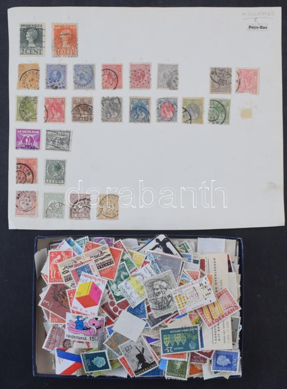 Hollandia néhány száz db áztatott bélyeg kis dobozban + lapra ragasztva