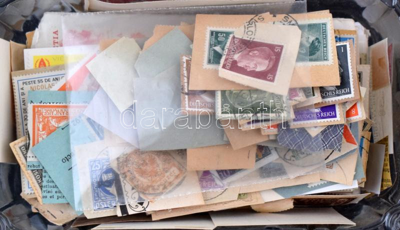 Pár száz darab áztatnivaló bélyeg, köztük Hitler-fejesek és alkalmi bélyegzések is, műanyag dobozban