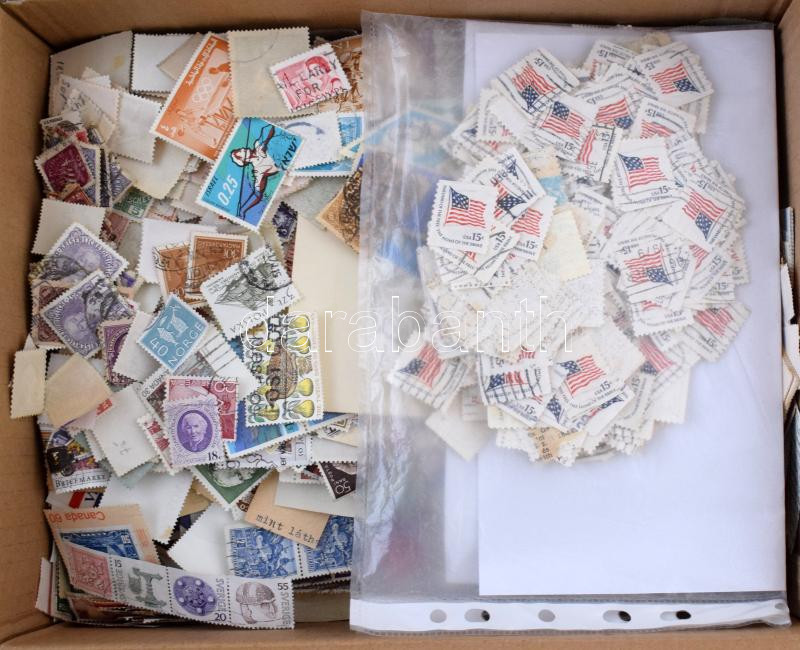 Sok száz darab vegyes külföldi bélyeg ömlesztve dobozban, benne sok USA