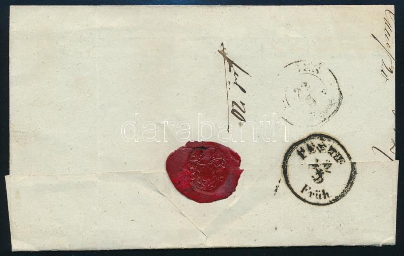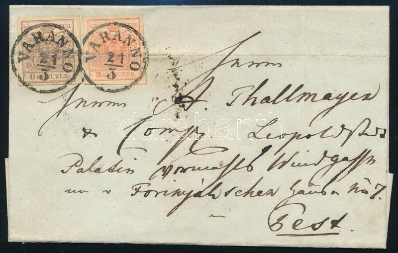 1856 6kr HP III. típus + 3kr HP III.a 2x típus levélen, mindkét bélyegen átmenő regiszterhajtás "VARANNO" - "PESTH / Früh"