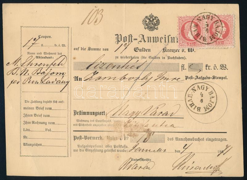 1871 1867-es 5kr pár 17Ft-ról szóló postautalványon, "BIHAR-NAGY BAJOM" - "NAGYVÁRAD"