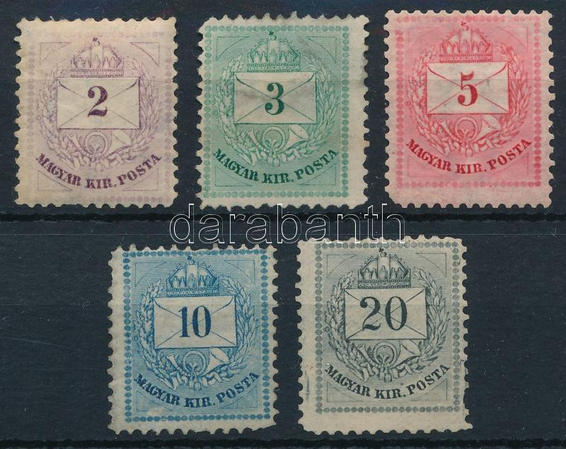 1881 5 db bélyeg harmadosztályú minőségben, 10kr és 20kr újragumizva / regummed (mixed quality)