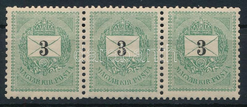 1898 3kr postatiszta hármascsík 12 : 11 3/4 fogazással, lefelé tolódott értékszámokkal!