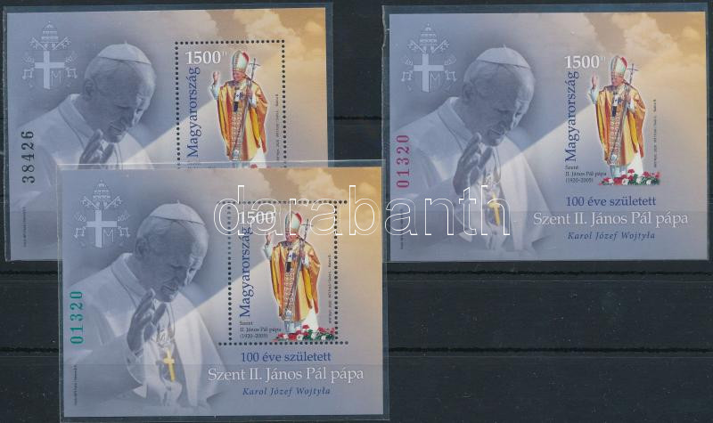 2020 100 éve született II. János Pál pápa 3 klf blokk: alap + zöld sorszámmal + vágott piros sorszámmal (a zöld és piros azonos) (24.500)