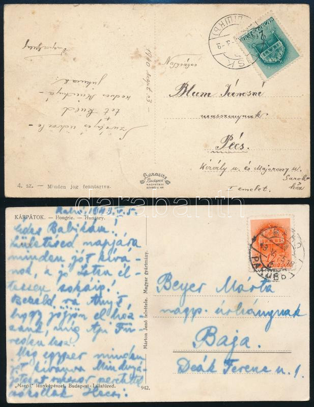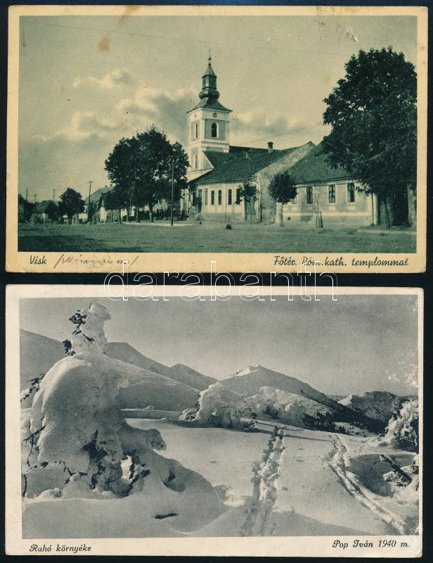 1940-1943 2 db képeslap "VISK" és "RAHÓ" magyar-rutén 2 nyelvű bélyegzéssel érvényteleínett bélyegekkel