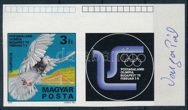1975 Postagalamb Olimpia vágott ívsarki szelvényes bélyeg a tervező aláírásával