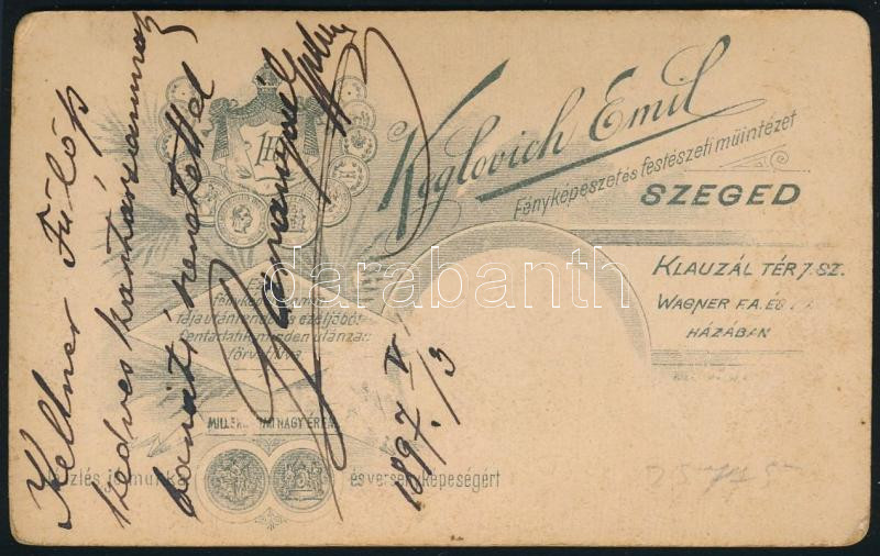 1897 Baranyai Gyula (1859-1932) polgári iskolai igazgató dedikált fotója Kellner Fülöp iskolaigazgató részére (,,Kellner Fülöp kedves kartársamnak baráti szeretettel Baranyai Gyula"), vizitkártya Keglovich Emil szegedi műterméből, 10,5x6,5 cm