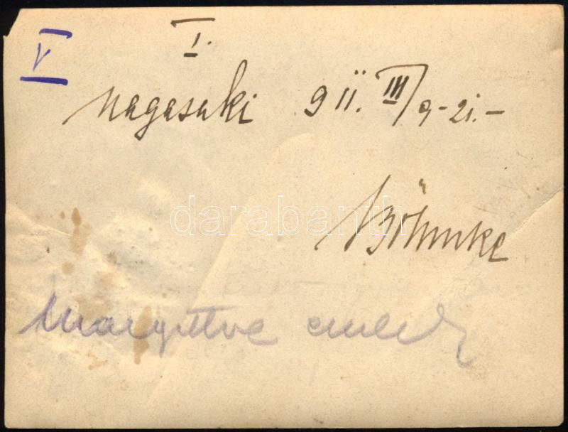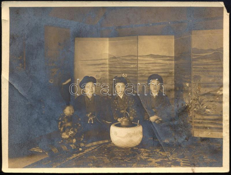 1911 Nagaszaki, japán nők és kisgyermek, a hátoldalon magyar feliratozott fotó, apró sarokhiánnyal, 8,5x11 cm