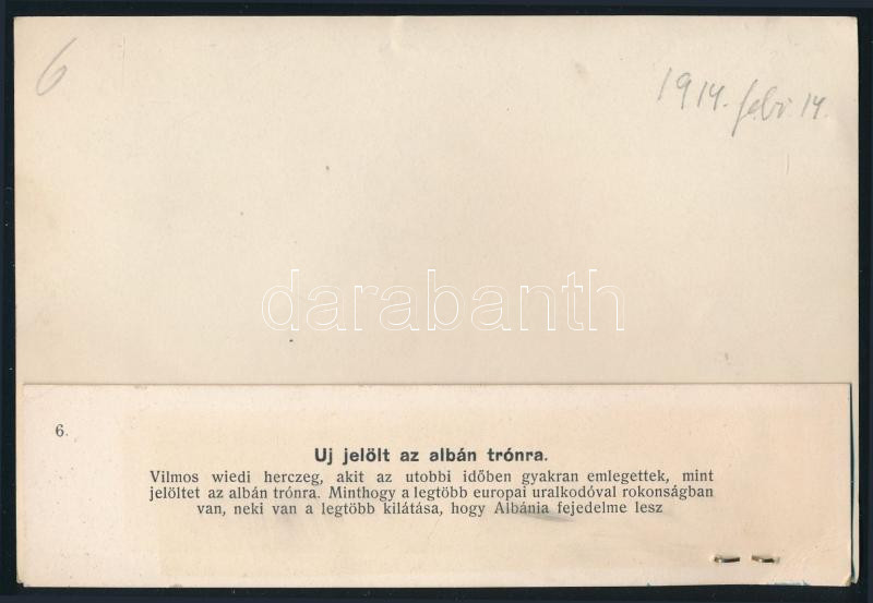 1914. febr. 14. Vilmos albán fejedelem (Wilhelm Friedrich Heinrich zu Wied herceg), ekkor még mint "jelölt az albán trónra" (egy héttel később, 1914. febr. 21-én lett de jure az Albán Fejedelmség uralkodója), korabeli sajtófotó, a hátoldalon feliratozva, 16x11 cm