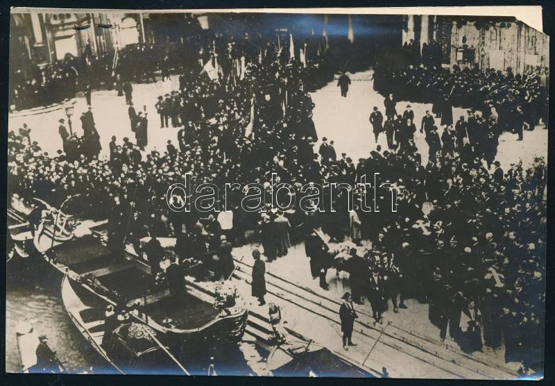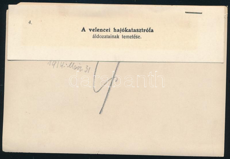 1914. márc. 31. A velencei hajókatasztrófa áldozatainak temetése, korabeli sajtófotó, a hátoldalon feliratozva, kis sarokhiánnyal, 11x16,5 cm