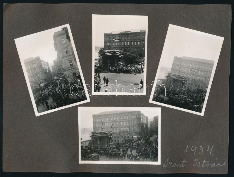 1934 Budapest Lánchíd, Fő utca, Szent István napi ünnepségek. 6 db fotó, albumlapokon 6x9 cm