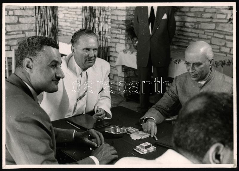 1956 Joszip Broz Tito jugoszláv, Nehru indai Nasszer egyiptomi elnök Brioni szigetén az el nem kötelezett országok találkozóján 24x16 cm Eredeti fotó