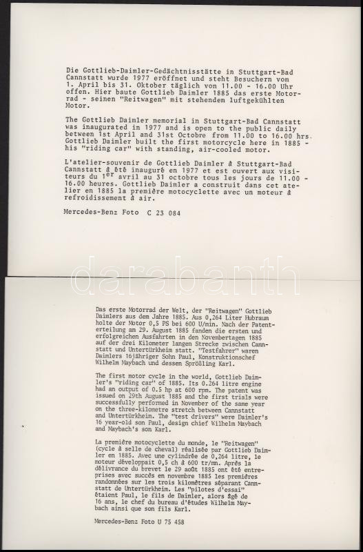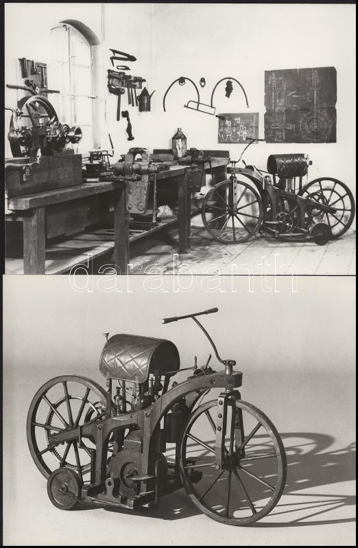 A világ első motorkerékpárja, "Reitwagen" Gottlieb Daimler, 3 db hátoldalon feliratozott sajtófotó, 16,5×21,5 cm