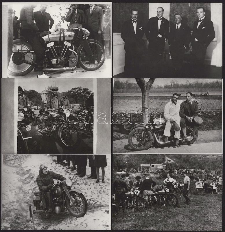 Motorversenyzők és autóversenyzők, motorversenyek, pl. Martinek István Ardie motoron, Caracciola, Stuck, Borzacini, Zinneberg, tihanyi verseny, frontharcos túraút, 6 db reprodukciós fotó, 6,5×9,5 cm