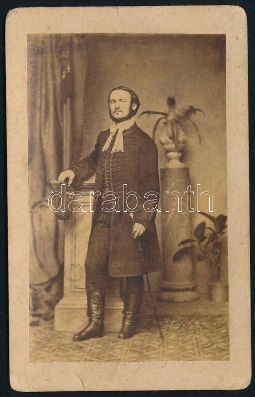 cca 1860 Férfi egész alakos portréja, keményhátú fotó Knézevits György pécsi műterméből, 10,5×6,5 cm