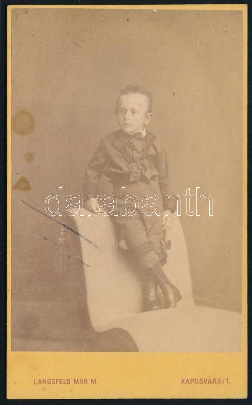 cca 1870 Kisgyerek portréja, keményhátú fotó Langseld Mór kaposvári műterméből, 10,5×6,5 cm