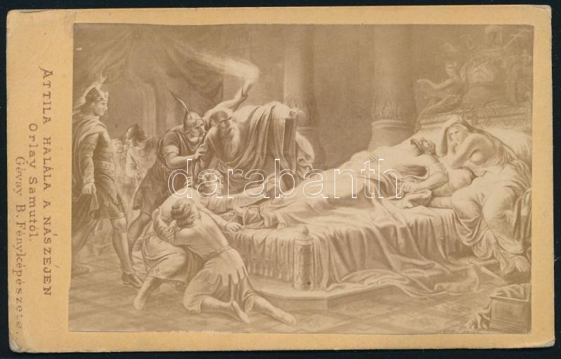 cca 1870 Orlay: Attila halála, festmény nyomán készült keményhátú fotó Gévay Béla pesti műterméből, 10,5×6,5 cm
