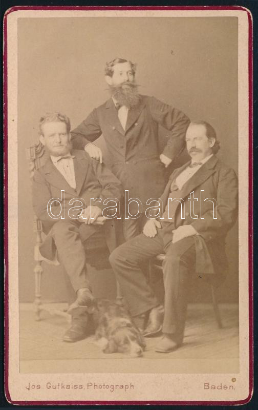 cca 1880 Férfitársaság portréja, keményhátú fotó Gutkaiss (Baden / Neusohl - Besztercebánya) műterméből, 10,5×6,5 cm