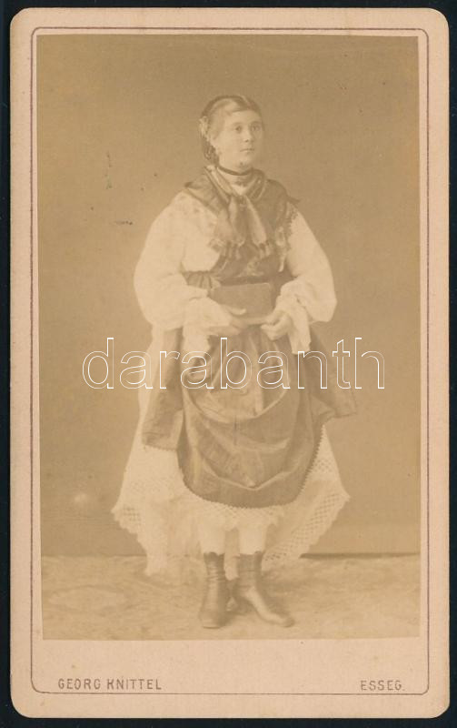 cca 1880 Nő népviseletben, keményhátú fotó Georg Knittel eszéki műterméből, 10,5×6,5 cm