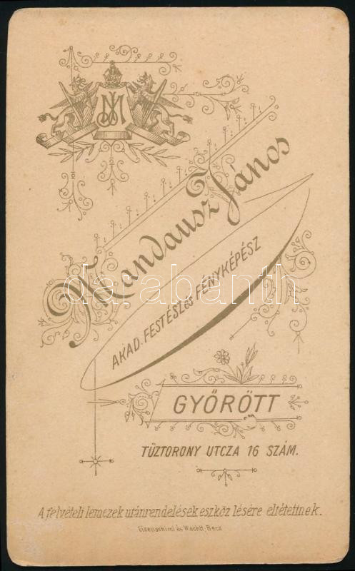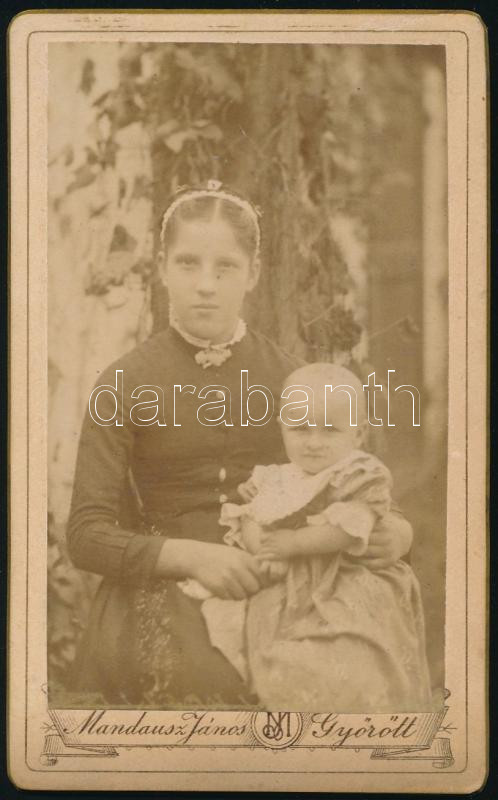 cca 1890 Fiatal lány kisgyermekkel, vizitkártya Mandausz János akad. festész és fényképész győri (Tűztorony u. 16.) műterméből, 11x6,5 cm. Ritka!