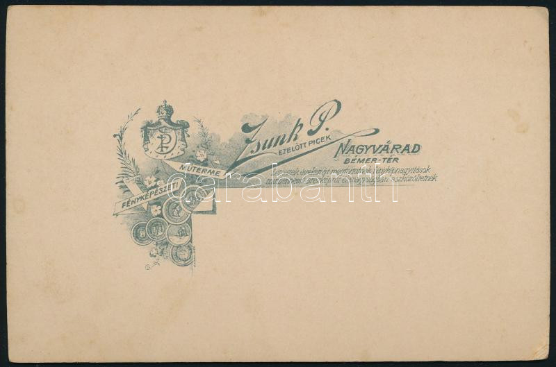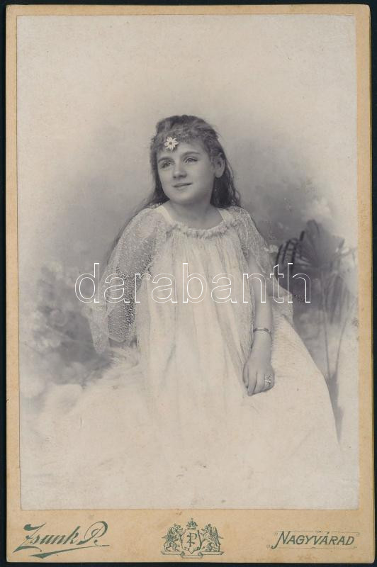cca 1890 Kislány jelmezben, keményhátú fotó Zsunk nagyváradi műterméből, 16,5×10,5 cm