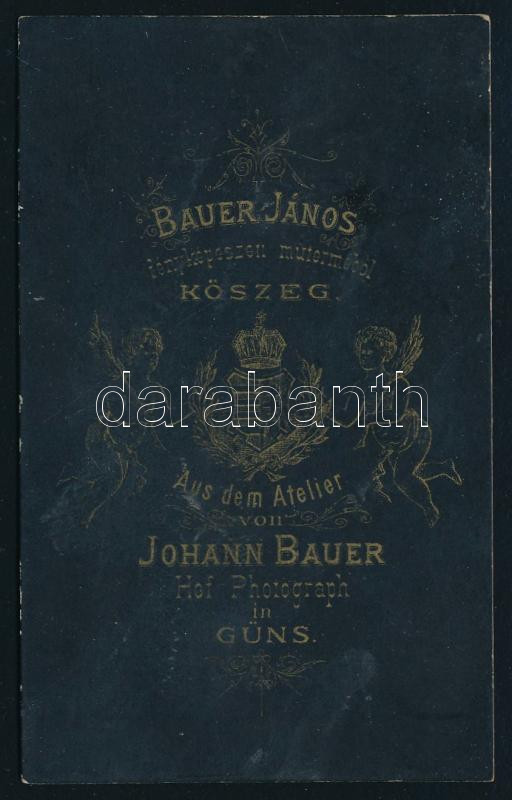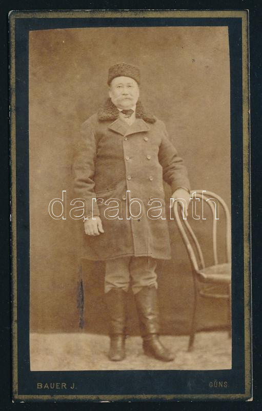 cca 1890 Szőrmesapkát és kabátot viselő idős úr portréja, vizitkártya Bauer János kőszegi (németül Güns) műterméből, 10,5x6,5 cm. Ritka!