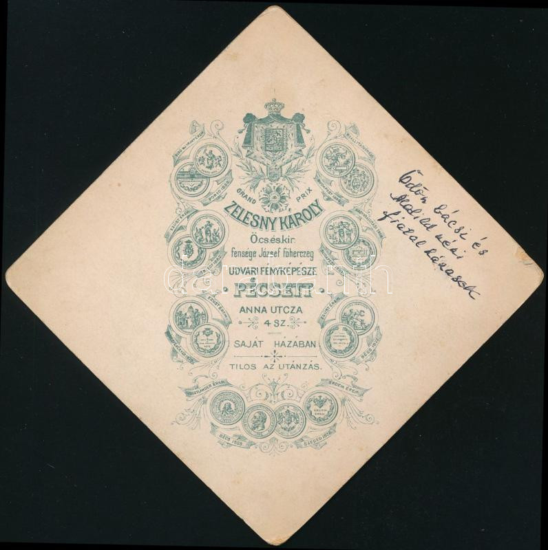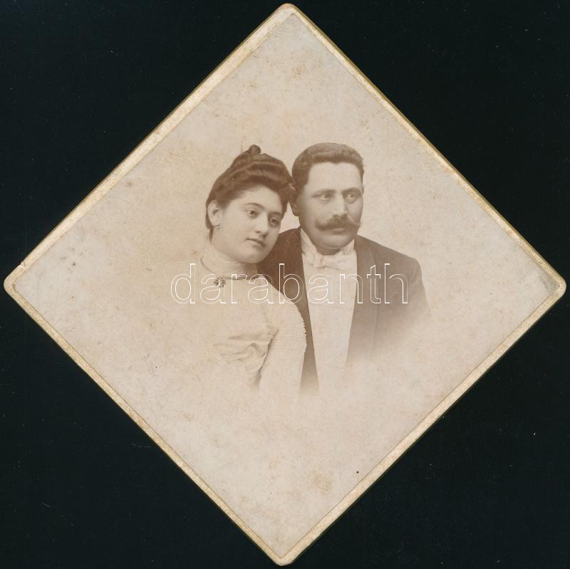 cca 1895 Házaspár portréja, keményhátú fotó Zelesny Károly udvari fényképész pécsi műterméből, 11x11 cm