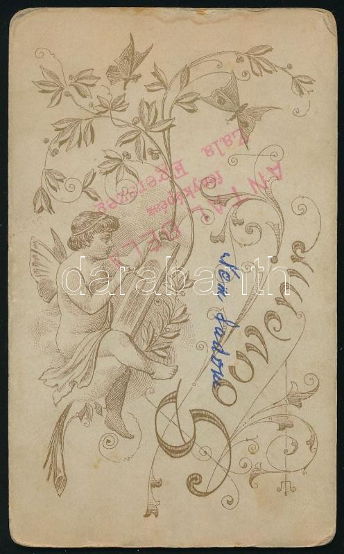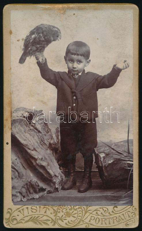 cca 1895 Kisfiú kitömött bagollyal, vizitkártya Antal Béla zalaegerszegi műterméből, a verzón pecséttel jelzett, kissé foltos, 10,5x6,5 cm