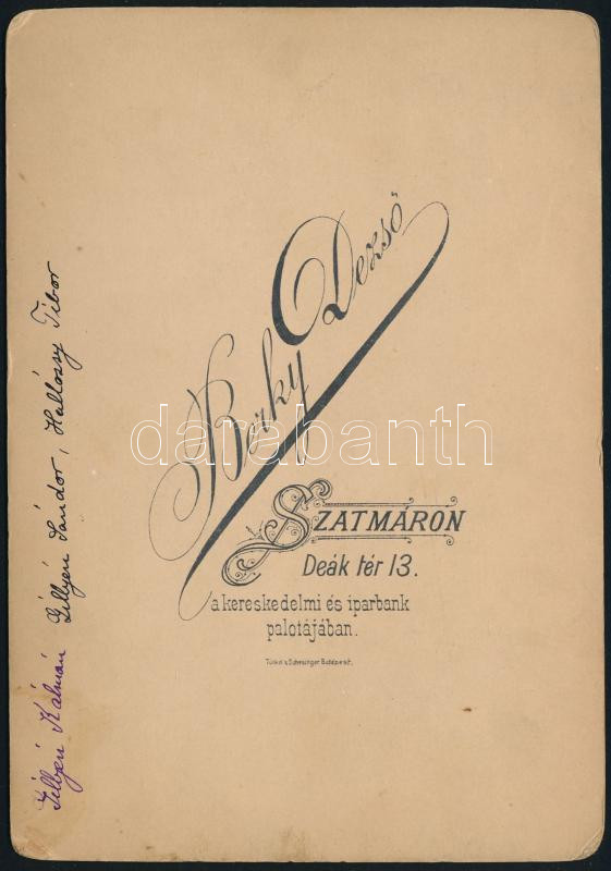 cca 1900 Három fiatalember portréja, keményhátú fotó Berky Dezső szatmári műterméből, 16,5×10,5 cm