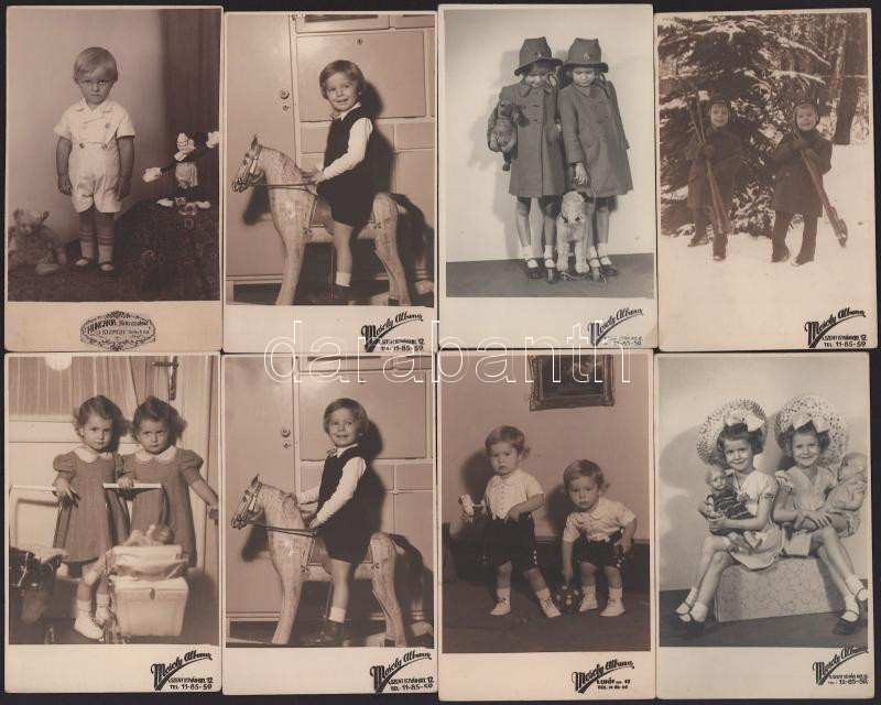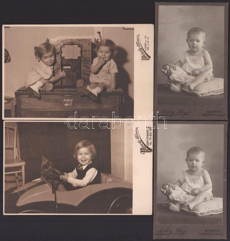 cca 1930-1940 Gyerekeket ábrázoló fotólapok, 10 db, Mosoly Albuma (V., Szent István krt. 12.), 13,5x8,5 cm + 1910 Kisgyermek portréja, 2 db vizitkártya Balog Hugó budapesti műterméből, 10,5x6,5 cm