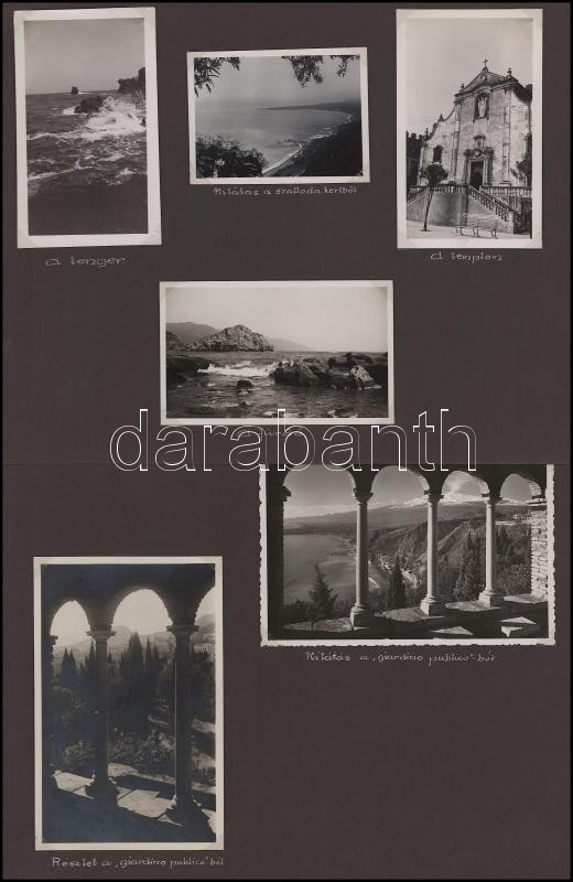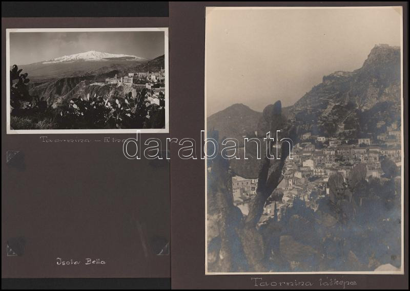 cca 1930-1940 Taormina és környéke (Szicília, Olaszország), összesen 8 db fotó, két albumlapon fotósarkokkal rögzítve (kivehető), 6x8,5 cm és 23x17 cm között