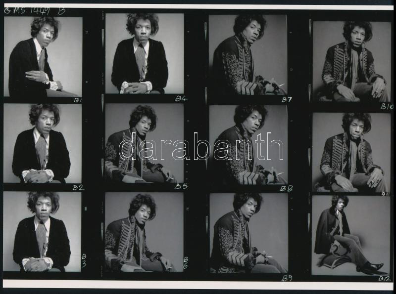 cca 1968 Jimi Hendrix (1942-1970) amerikai énekes, gitáros, zeneszerző portréi egy kontaktlapon, 1 db modern nagyítás, jelzés nélkül, 15x21 cm