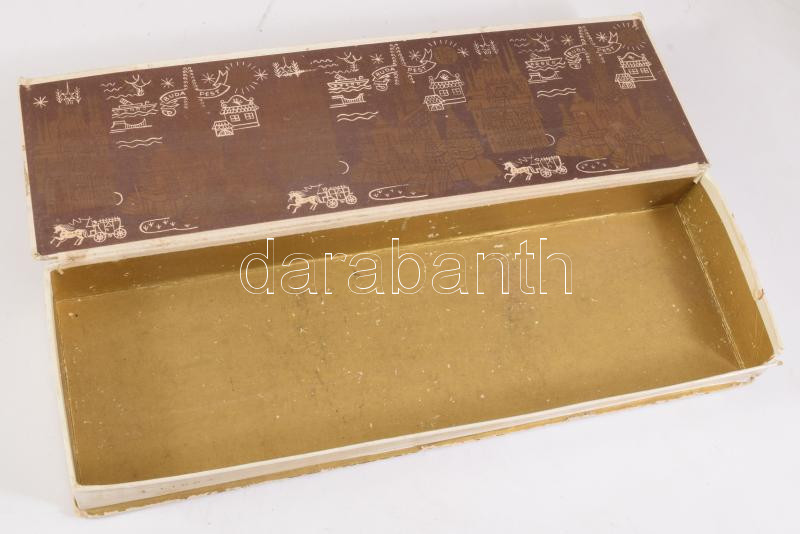 Chocolate cherry liqueurs (konyakmeggy) export bonbonos doboz, belül budapesti illusztrációkkal díszített, szign. Szécsiné, viseltes állapotban, 31x10x3,5 cm