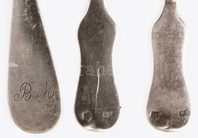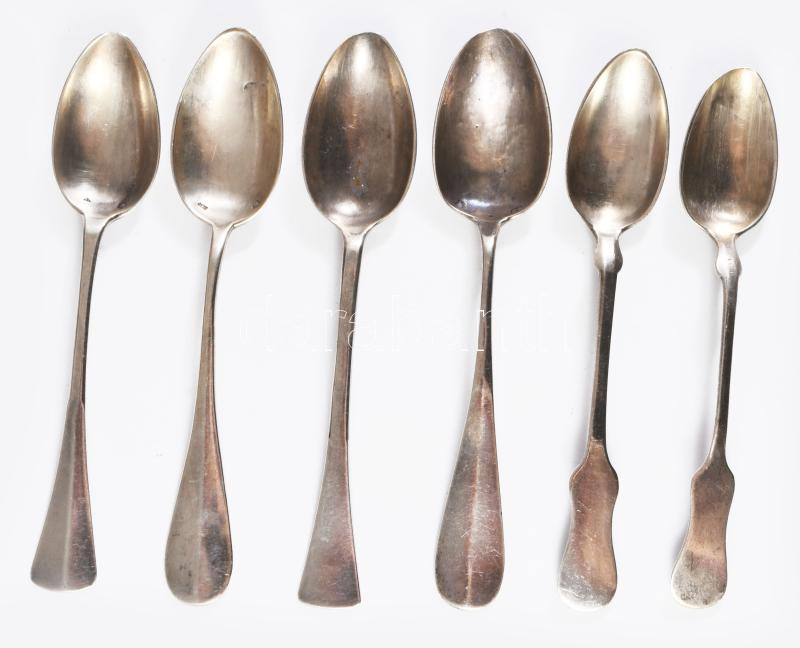 6 darab ezüst (Ag) teás kanál, Pest, Bécs 1872-1922/37 közötti fémjelek, 800 ezrelékes ezüst, nettó 148g