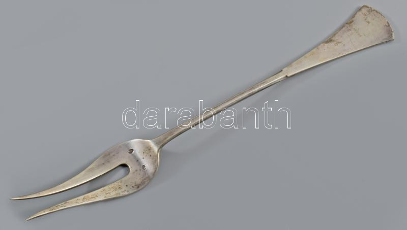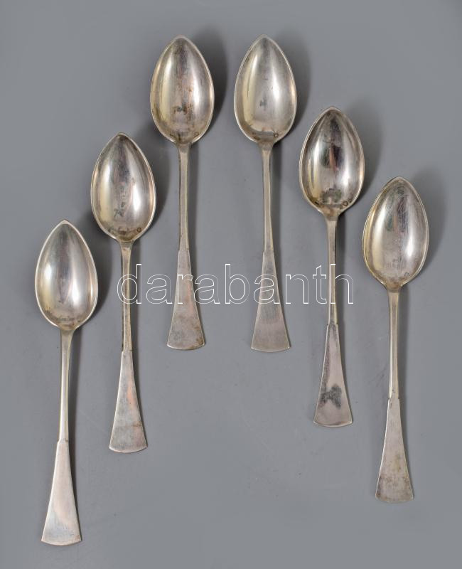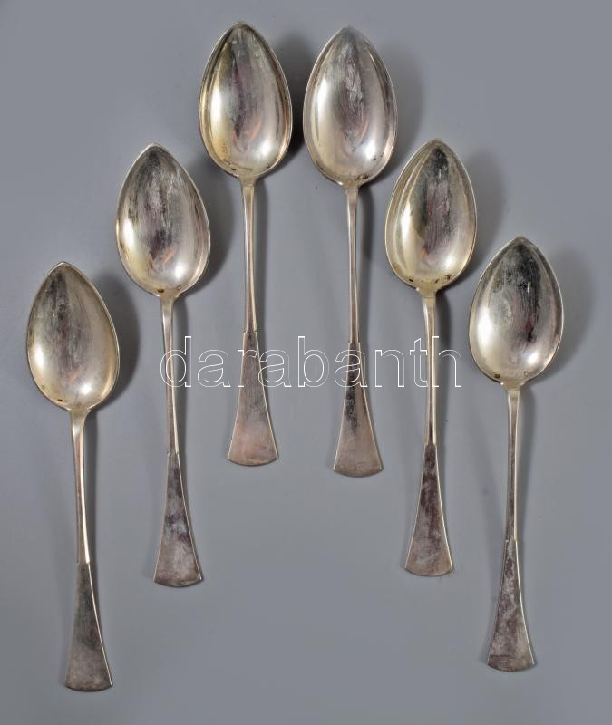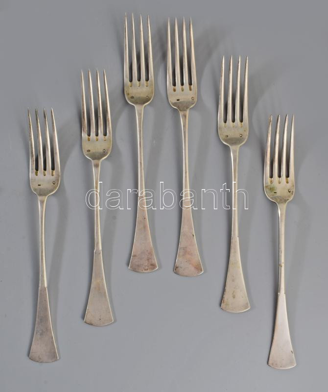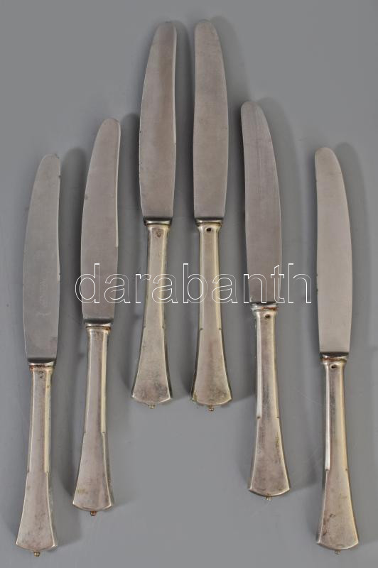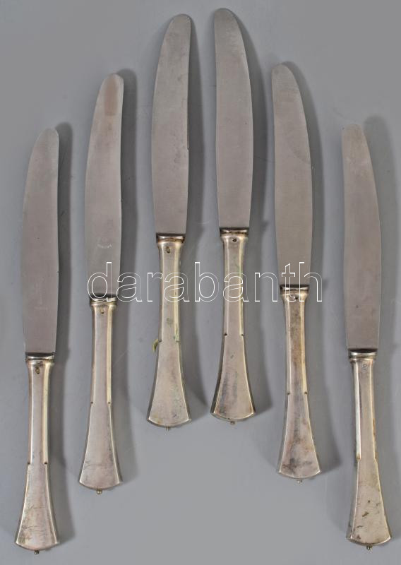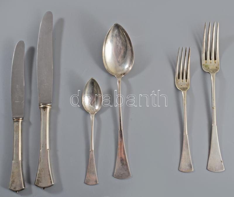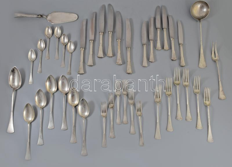 Ezüst (Ag) 6 személyes 40 részes evőeszköz készlet, 1872-1937, illetve 1937-1966 közötti fémjel, klf mesterjeggyel. Nettó 1646 g + ezüst nyelű kések bruttó 735g