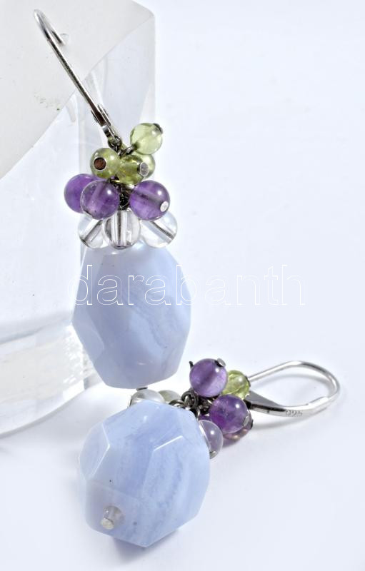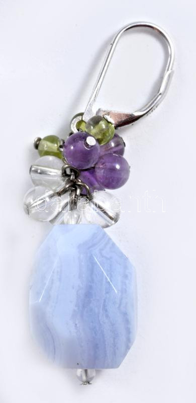 Ezüst (Ag) fülbevaló pár, kalcedon, ametiszt gyöngyökkel, jelzett, bruttó 11,3g